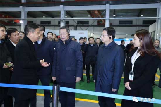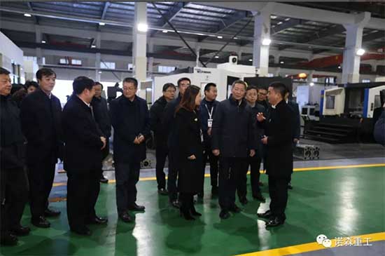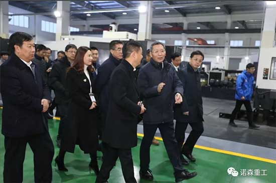 2019年12月18日,鹽城市委書記戴源、市長曹路寶及副市長、濱??h委書記孫軼、縣長劉永軒等領導一行蒞臨江蘇諾森重工有限公司參觀考察企業(yè)發(fā)展情況。諾森重工董事長劉春梅,總經理王海濤全程陪同視察。